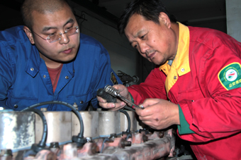 去年6月份,19岁的李嘉兴分到组里。上班的第一天,面对巨无霸似的通道公交车、轰鸣的发动机,心里不免有些激动,这儿看看,那儿摸摸。“小伙子,保养组可不是那么好玩的,看似平常,可处处都存在着风险,只有真正懂得和重视安全,才能保证自己的安全啊!”车间书记与连江对他说。随后转身说:“张师傅,小李就交给您了,您可得把住关啊!”就这样,在高高架起的公交车辆前李嘉兴拜了师傅,成了我的小师弟。