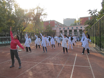 “广播体操第四节体侧运动,一、二、三、四……”走出病房,摘下口罩,伴着微风,听着音乐,披着阳光,举起手臂,舒展筋骨。日前在花园式的北京市和平里医院羽毛球场地内,近30位白衣天使跟着领操人——院工会工作者张雅丽的标准动作,开始做起工间操。