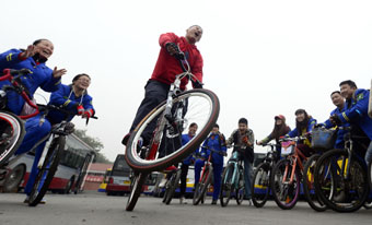 “嘿,真棒!自行车技术哪家强?”昨天,公交客三分公司十队的场站内,十几名公交一线职工各执一辆自行车围成一团,分别展示自行车“特技”。这些公交职工组成“车友会”,利用业余时间开展兴趣活动。为了保证职工在放松心情的同时身体安全,车队党支部、工会、团支部为车友会的职工准备了骑护用具,让他们开心休闲。