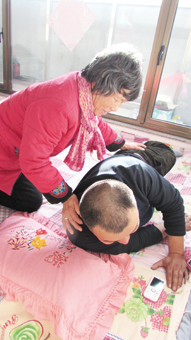 大姐来了,妻子肖冬香可以安心上班了,白天照顾李学成的重任就交给了大姐。大姐今年已经六十岁了,瘦小的脸上爬满了皱纹,头发也已经花白,“刚开始的时候,我兄弟只能躺在床上,一动也不能动,吃饭都需要喂,后来稍微好点,我就使劲往上抬他,让他慢慢坐起来……”大姐边说边比划着。看着李学成和大姐有些悬殊的体型,相信大姐每挪动李学成一点都要费很大劲。