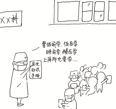 “全员停休,全力备战!”在孙倩创作的医改漫画的开篇画面里,顺义区医院医改行动打响。为了保障医改前后就医顺畅,对接平稳,顺义区医院全体医护人员连日停休,顺利完成了系统升级。