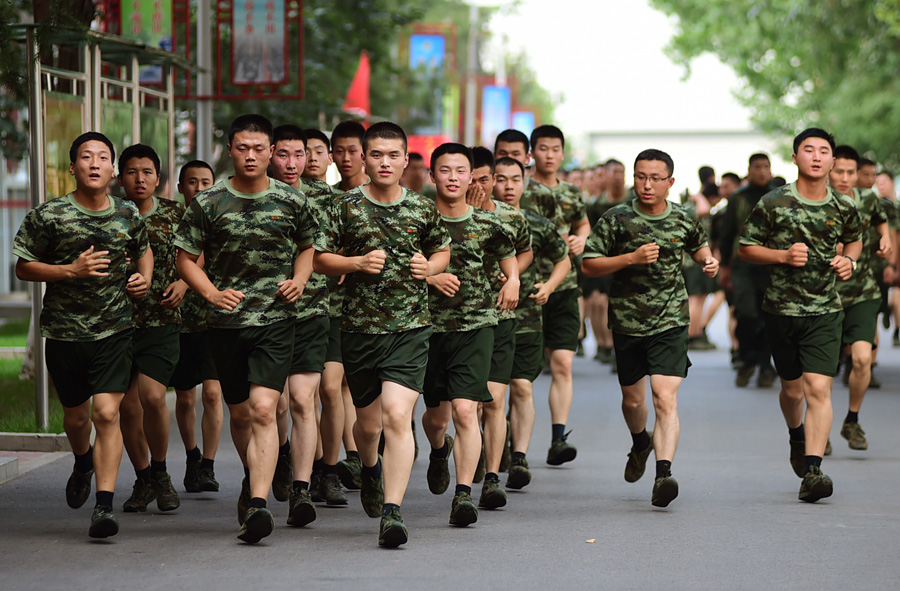 在烈日下的训练操场,记者看到,在《义勇军进行曲》的节奏中,战士们边喊口号,边手持礼宾枪踢着正步,战士们脸上的汗水顺着脖子流淌下去,后背的衣服全部湿透……从练兵场走向阅兵场,从入伍新兵到准仪仗队员,再到正式仪仗兵,从理论到操练都有严格的考核。每名仪仗队员每年淌下的汗水都有一吨重,穿破制式皮鞋7双,训练行程超过2000公里。每名仪仗队员服役期间所踢正步,相当于一个两万五千里长征。