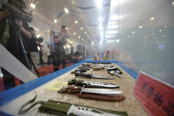 昨天,第六届轨道交通安检实物宣传展在地铁14号线大望路站启动。京港地铁公司数据显示,今年上半年,地铁安检出的违禁品中菜刀、水果刀等刀具最多。(7月3日《京华时报》)