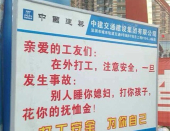 “亲爱的工友们:在外打工,注意安全,一旦发生事故:别人睡你媳妇,打你孩子,花你的抚恤金!打工安全,为你自己。”前日,这段颇具个性的安全教育标语引发了微博网友们热转,它被大家称为史上最“狠”安全教育广告。南都记者调查发现,这块安全教育标语的告示牌就位于罗湖区笋岗路和红岭路路口的地铁九号线工地门口。(8月5日《南方都市报》)