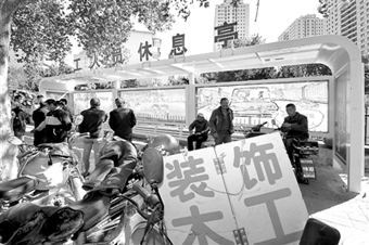 10月13日,山东省烟台市大海阳路,由烟台市芝罘区城管大队为街头零散务工人员设立的“务工人员休息亭”正式启用,平日聚集在路边等零活的务工人员有了遮风挡雨和休息的场所。(10月14日《工人日报》)