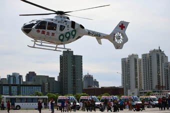 “地面发生塌陷,请速打999救援电话!”昨天,在奥林匹克公园中心广场的突发事件应急演练现场,首都紧急救援志愿服务站接到群众求救电话后,999紧急救援队及时出动,专业航空救援直升机、医疗急救车、急救摩托车、紧急救援志愿者联合行动,进行了密集场所发生地面塌陷事件、引发恐慌踩踏、导致人员受伤的模拟救援演练。 当天,北京市红十字会向全市首批26家“首都紧急救援志愿服务站”授牌,并向中国首都紧急救援志愿服务总队授旗。中国首都紧急救援志愿服务总队200名队员在现场展示了心肺复苏、创伤救助等救护技能演示。