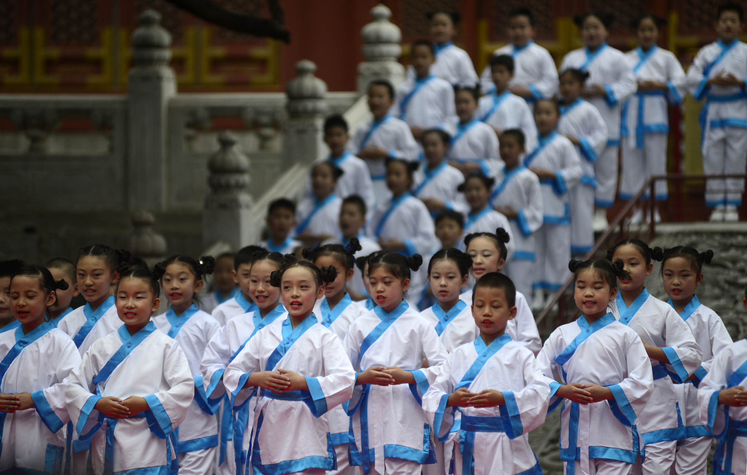 昨天,在具有700多年历史的孔庙大成殿广场前,一场庄严的“释菜礼”拜师仪式拉开了第五届北京孔庙国子监国学文化节的序幕。当天,东城区委、区政府在孔庙大成殿前举办庆祝教师节表彰活动,近700名优秀教师获表彰。此次活动与孔庙国子监国学文化节相结合,不仅具有发扬中华民族传统美德——尊师重教的历史意义,还具有提升当代教师荣誉感和使命感的现实意义。据了解,为期20天的国学文化节将陆续推出11项国学精品活动。