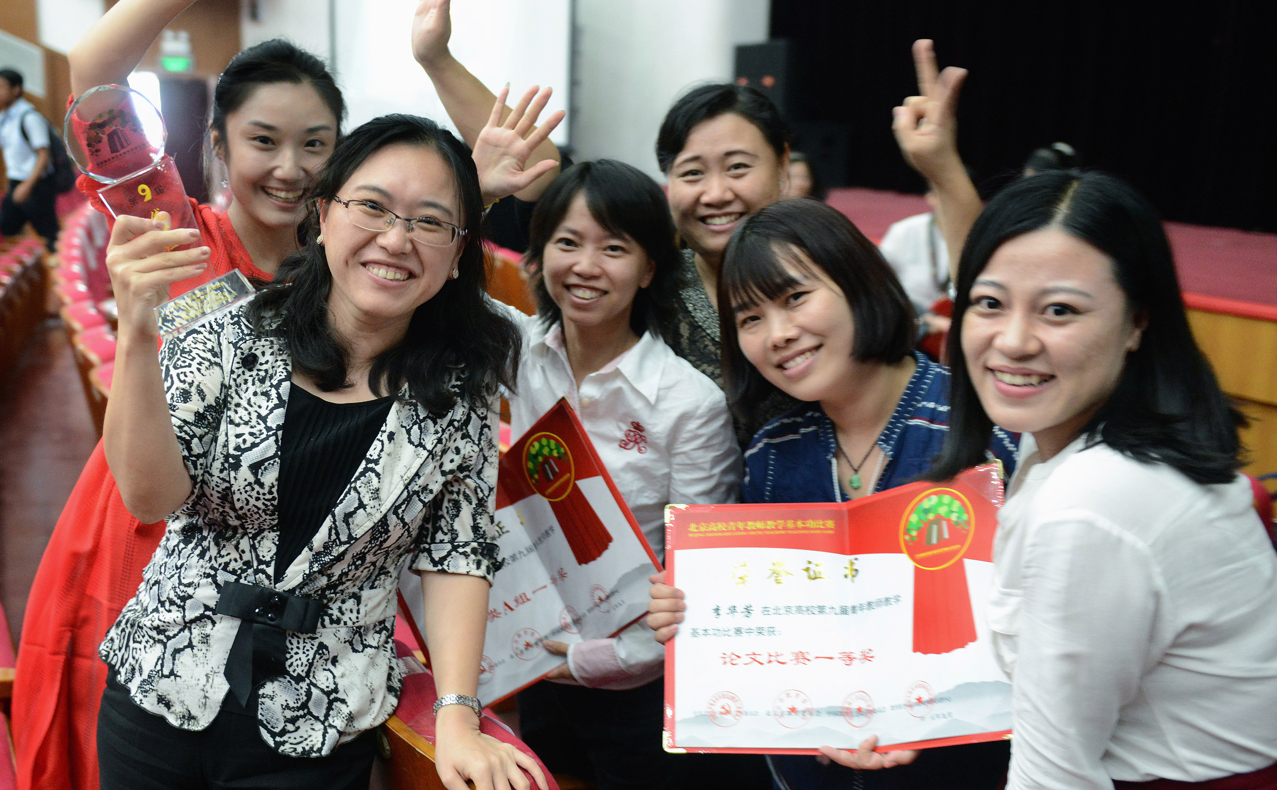 昨天,北京高校第九届青年教师教学基本功比赛暨“北京青教沙龙”在北京邮电大学举行。 141名选手分获文史类A\B组和理工类A\B组一、二、三等奖。获得文史组和理工组一等奖第一名的选手,市教育工会将按照有关程序向市总工会推荐授予其“首都劳动奖章”称号。会后,捧得奖杯的教师们相互交流、合影留念。