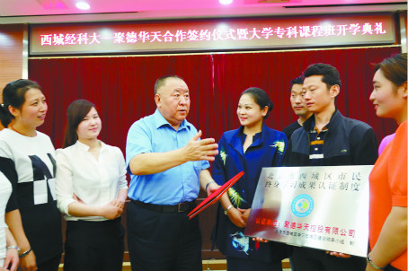5月9日,在西城经济科学大学二层礼堂举行了一场特殊的开学典礼,61名聚德华天控股有限公司旗下的14家中华老字号的一线职工圆了大学梦。他们将在一年半的学习时间里,完成管理学、人力资源管理、电子商务、市场营销等16门现代企业管理课程。成绩合格后,学员将获得西城经济科学大学颁发的大专课程毕业证书。据了解,为了培养人才,聚德华天此次合作办学的18.3万元学费,全部由公司党委书记、总经理朱玉岭用个人薪酬支付。