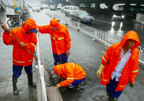 昨天,又一轮强降雨袭京城,城区大部分地区降大雨,东部局地暴雨。为防止路面和桥下积水,保障市民出行,北京排水集团和市政及环卫工人都坚守岗位及时排除积水。记者在莲花桥和刘家窑桥下看到,北京排水集团职工正冒雨清理下水道排水,以保障道路通行。