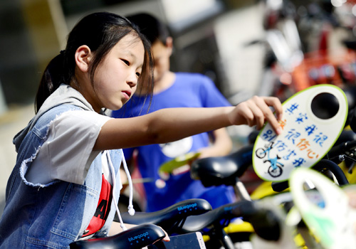 在“六一”儿童节即将到来之际,东城区东华门街道组织儿童将400多张宣传卡挂在共享单车上。这些宣传卡都是孩子们利用业余时间手绘制作完成,通过漫画和文明寄语倡导“文明骑行从我做起”。